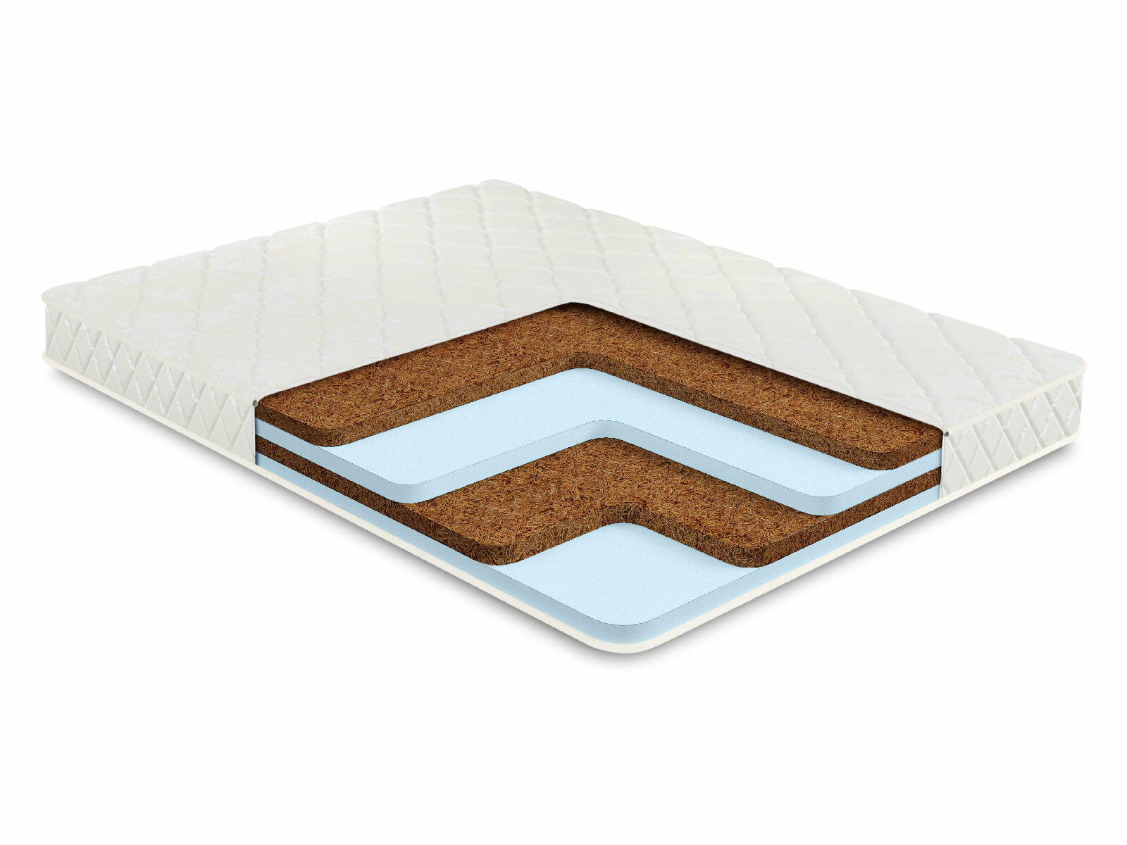 Внутри матраса установлены сразу два вида наполнителей, которые чередуются друг с другом. Природная кокосовая койра отвечает за более жёсткую сторону, а умеренная плотная пена Ecofoam передаёт мягкость противоположной поверхности.