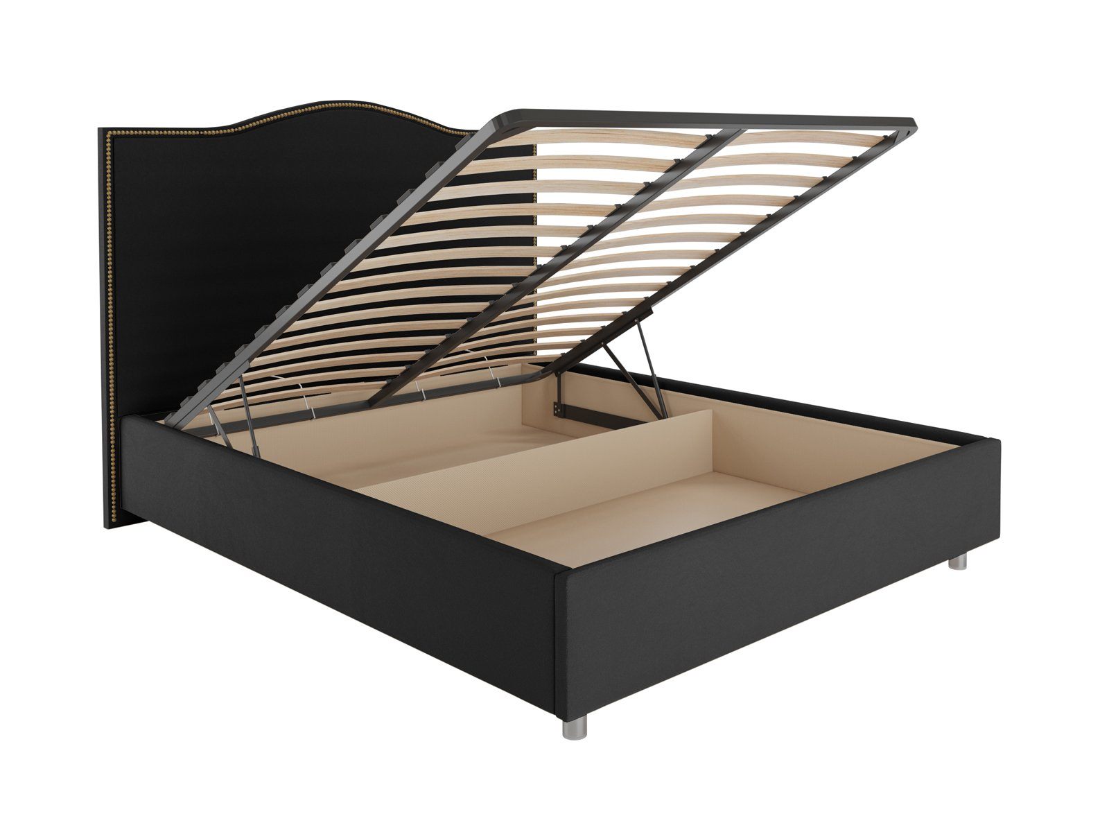 Кровать комплектуется металлическим основанием с подъемным механизмом, под которым находится вместительный бельевой ящик для хранения сезонных вещей и постельных принадлежностей.