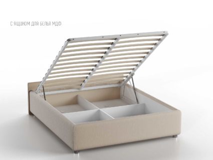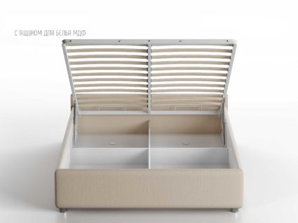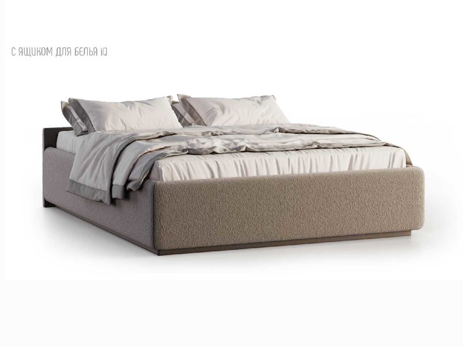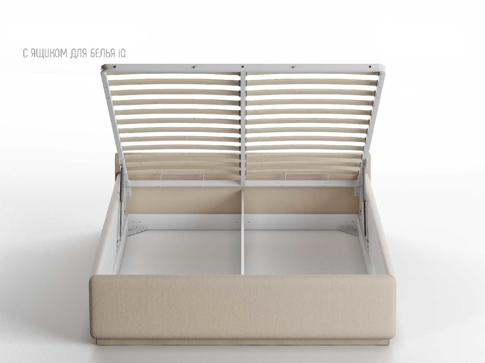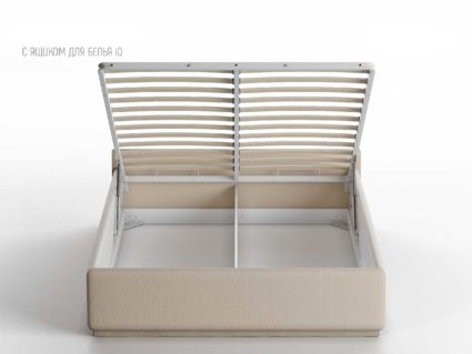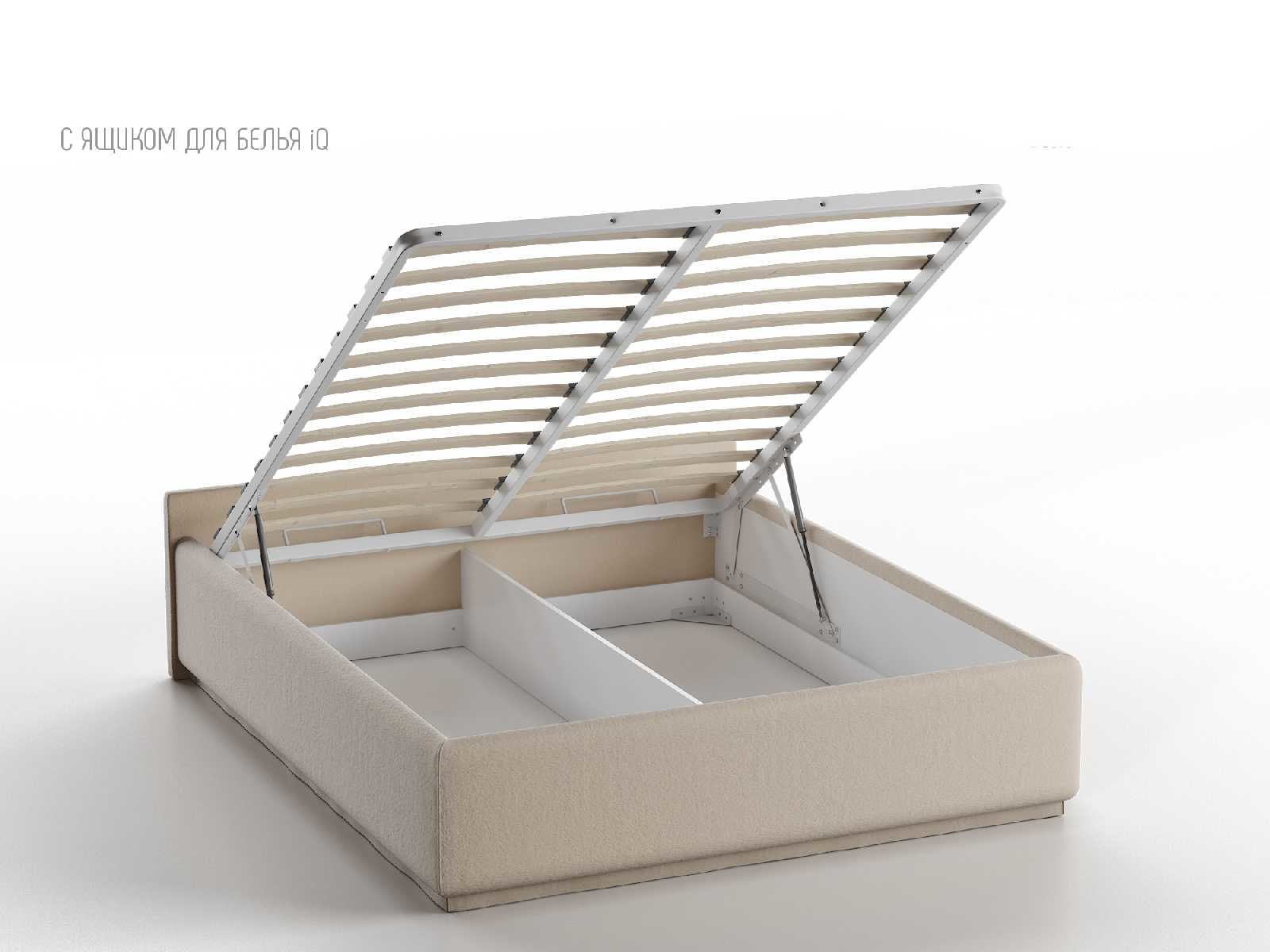 Кровать укомплектована IQ с подъемным механизмом и ящиком для белья без дна (дополнительная платная опция - дно к ящику IQ из HDF (ХДФ). Каркас кровати на цоколе, декоративный чехол на цоколе съёмный. Глубина ящика для белья - 30 см, без ограничения нагрузки на ящик.