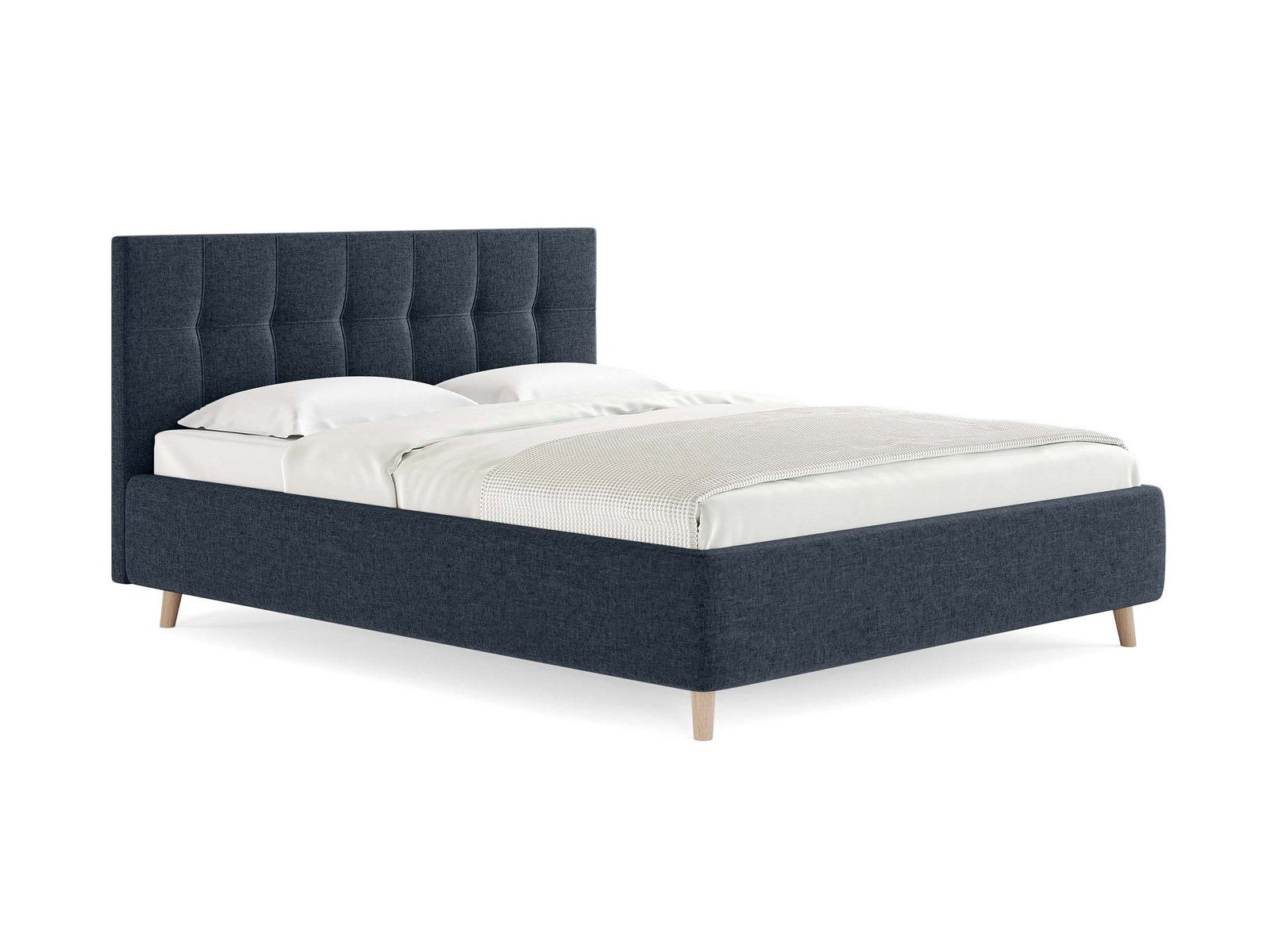Двуспальная кровать с мягким изголовьем подойдет для современных интерьеров спален, а благодаря высоким деревянным ножкам впишется в стиль ретро, скандинавский или минимализм.