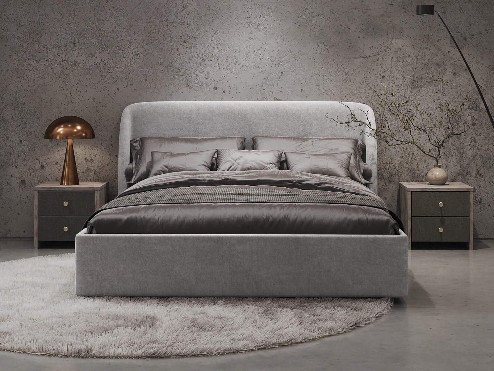 Кровать Nicole удачно подойдет для интерьеров в современном стиле, стиле минимализм и модерн. Дизайнерское закругленное изголовье, широкие царги и минимальный просвет от пола, делают спальное место особенно уютным. Задняя часть изголовья кровати выполнена в основной ткани, благодаря этому ее можно установить в центре комнаты. Кант на изголовье подчеркивает его выразительность.