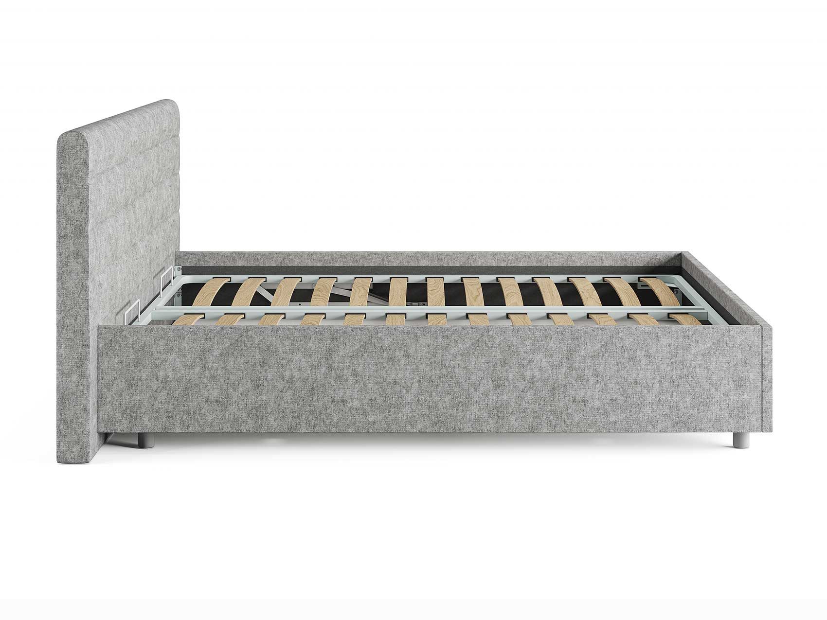 Кровать комплектуется металлическим основанием (без опор), которое имеет 13 рядов встроенных березовых ламелий на каждое спальное место, обеспечивая равномерное распределение нагрузки.