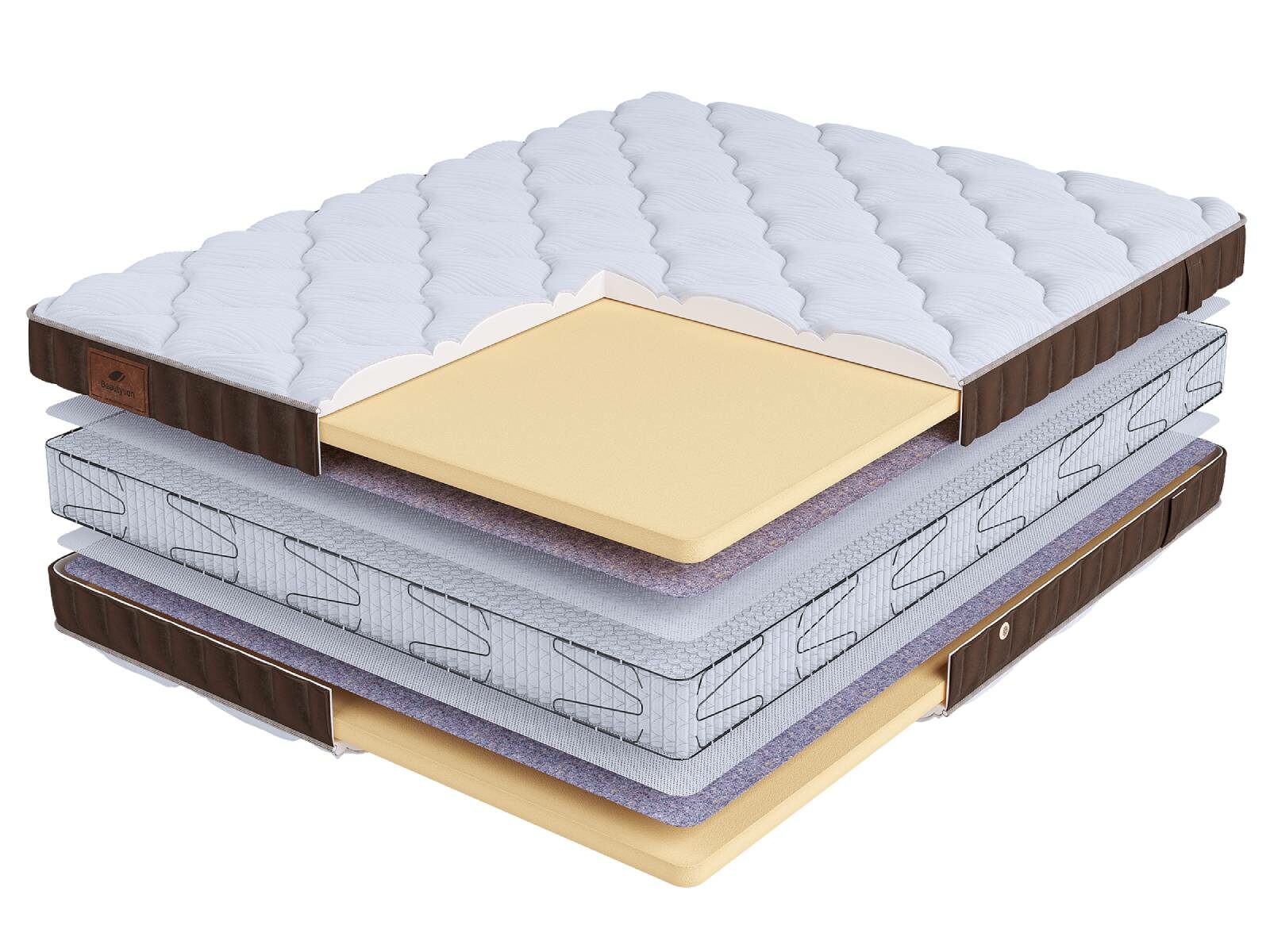 Хлопковая трикотажная ткань чехла обеспечивает комфорт и обладает отличной воздухопроницаемостью. Высокообъемная стежка с использованием холлофайбера (600гр.) подарит дополнительный комфорт спальному месту. Изысканный бурлет из мягкого велюра красивого бежевого цвета придает матрасу роскошный внешний вид и подчеркивает его премиальный статус. Каждая модель серии LIFE украшена фирменной кожаной биркой BeautySon, подтверждающая исключительность каждого матраса.