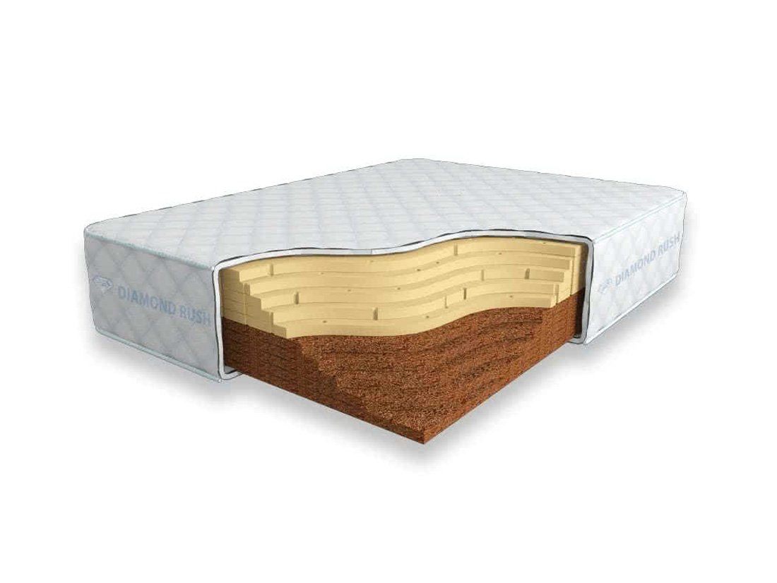 Матрас Diamond Rush Cocos Contrast 30 DR является беспружинным, т.е. не имеет в своей основе пружинного блока. Особенность этой модели в том, что она сочетает в себе сразу мягкий и жесткий матрасы. С одной стороны идут слои латексированной кокосовой койры (3см), с другой – натурального латекса с перфорацией (3см).