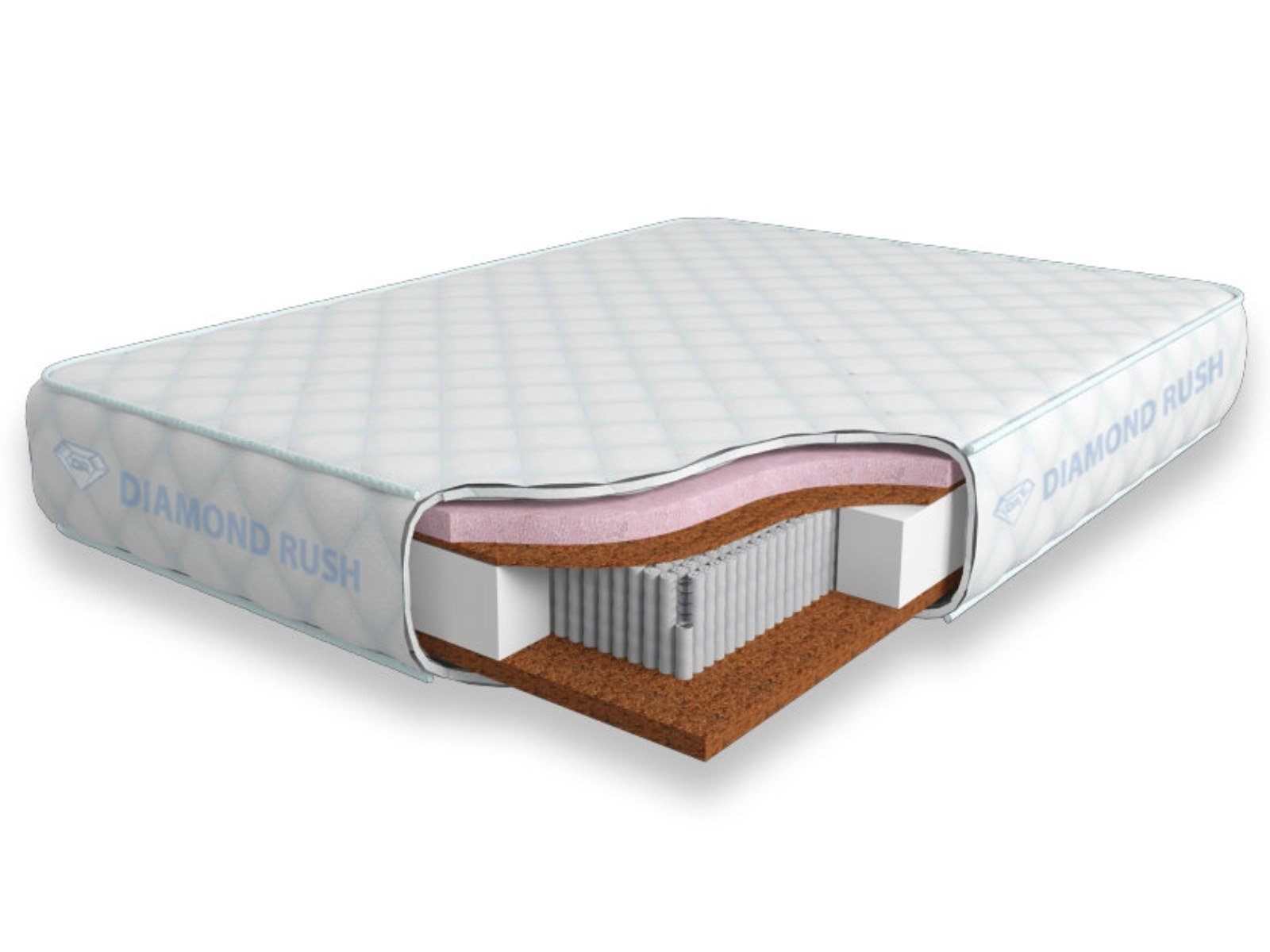 Данный матрас из серии Luxury Diamond имеет в своей основе независимый пружинный блок 3000, состоящий из пружин диаметром 2-3 см. В качестве настилочных слоев поверх пружинного блока используются листы латексированной кокосовой койры и мягкого материала с эффектом памяти – Меморикса. Матрас является жестким с одной стороны и среднежестким (ближе к мягкому) с другой.
