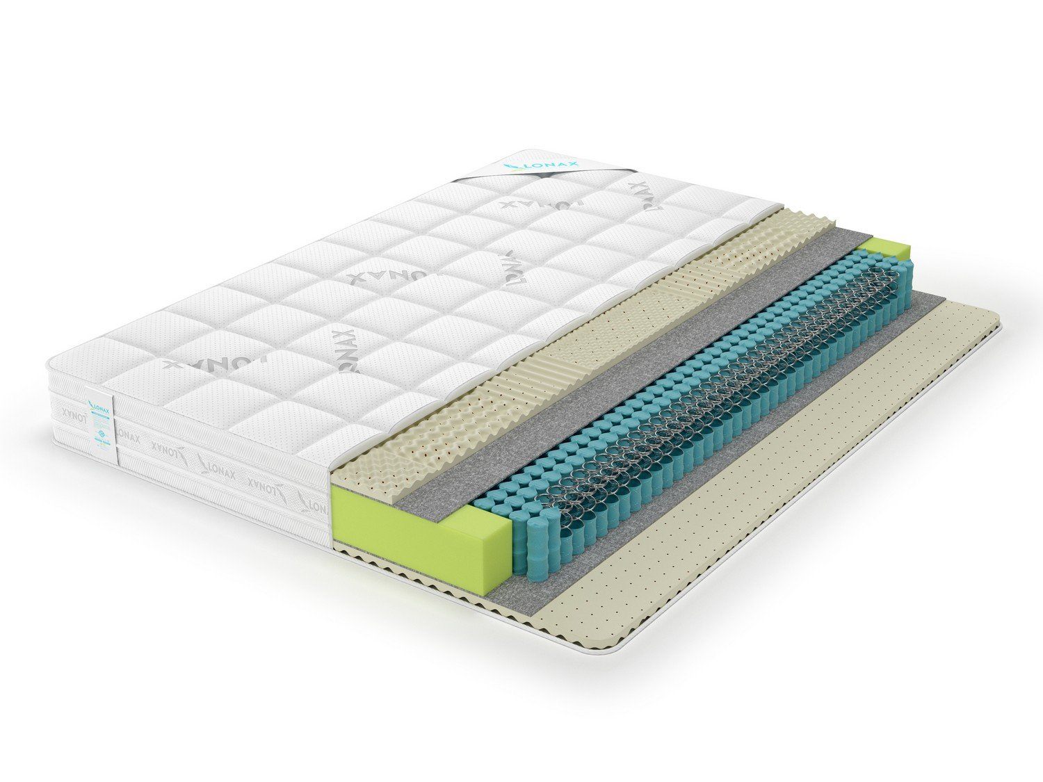 Слои латексной пены также имеют специальную структуру. Полотно наполнителя поделено на 7 зон, где каждая из областей имеет собственную плотность и разновидность фигурной резки. Сделано это для того, чтобы более качественно адаптироваться под фигуру. Например, в местах с наибольшей нагрузкой, где приходятся бёдра и плечи, пена получила более интенсивную плотность.