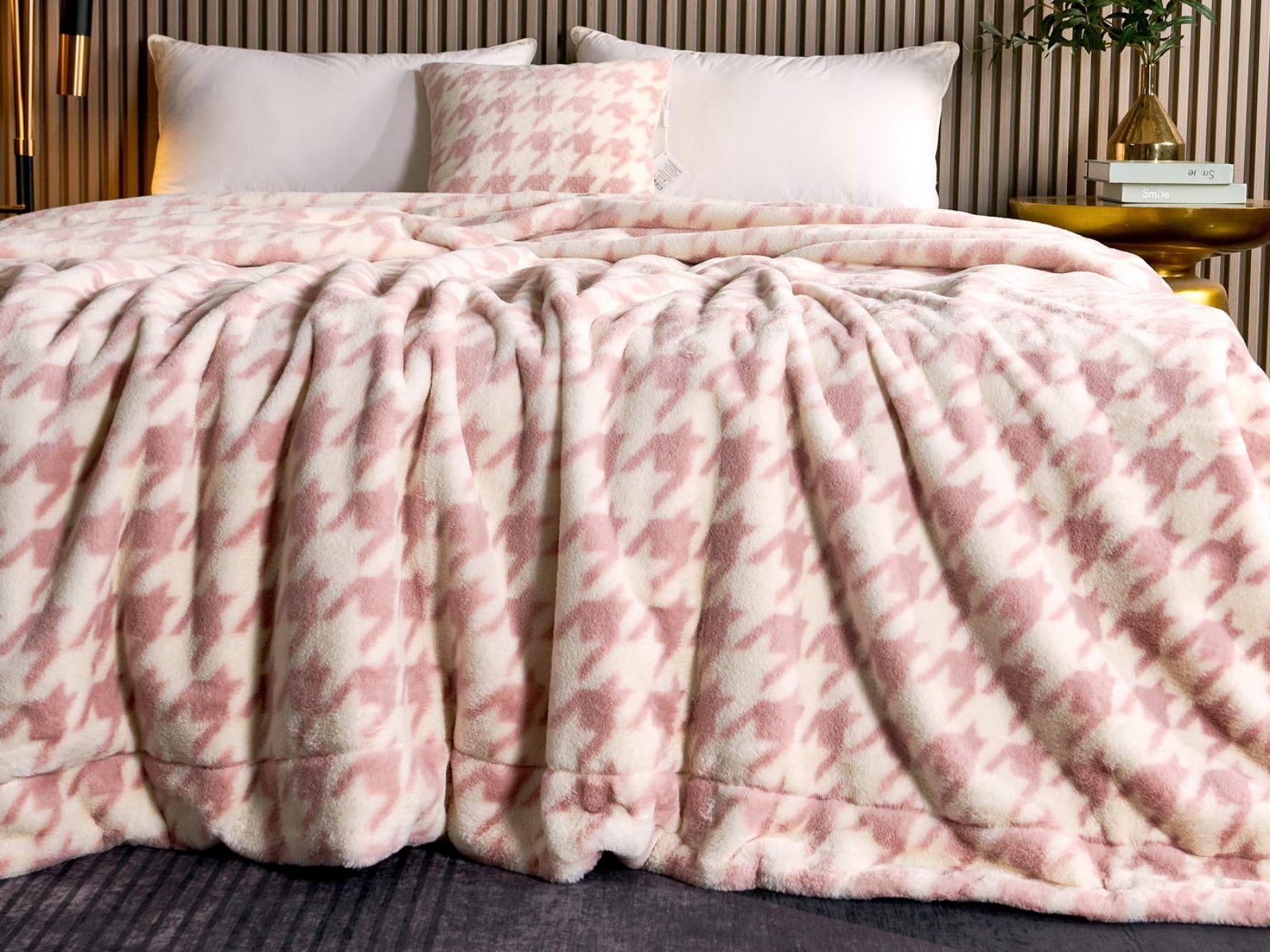 Sofi De Marko представляет вашему вниманию коллекцию Эрнесто, включающую в себя пледы и декоративные наволочки из искусственного меха с принтом «гусиная лапка».