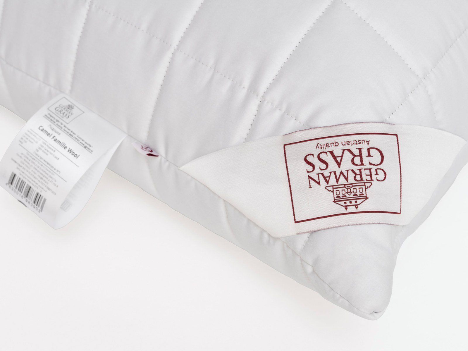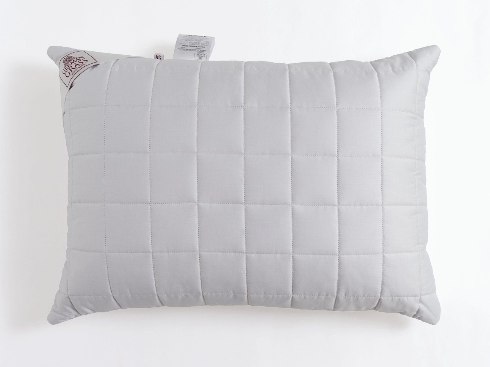 Подушка Camel Familie Wool с регулируемой степенью комфорта в гладком сатиновом чехле из 100% хлопка, наполненном термоскрепленным пластом из верблюжей шерсти.