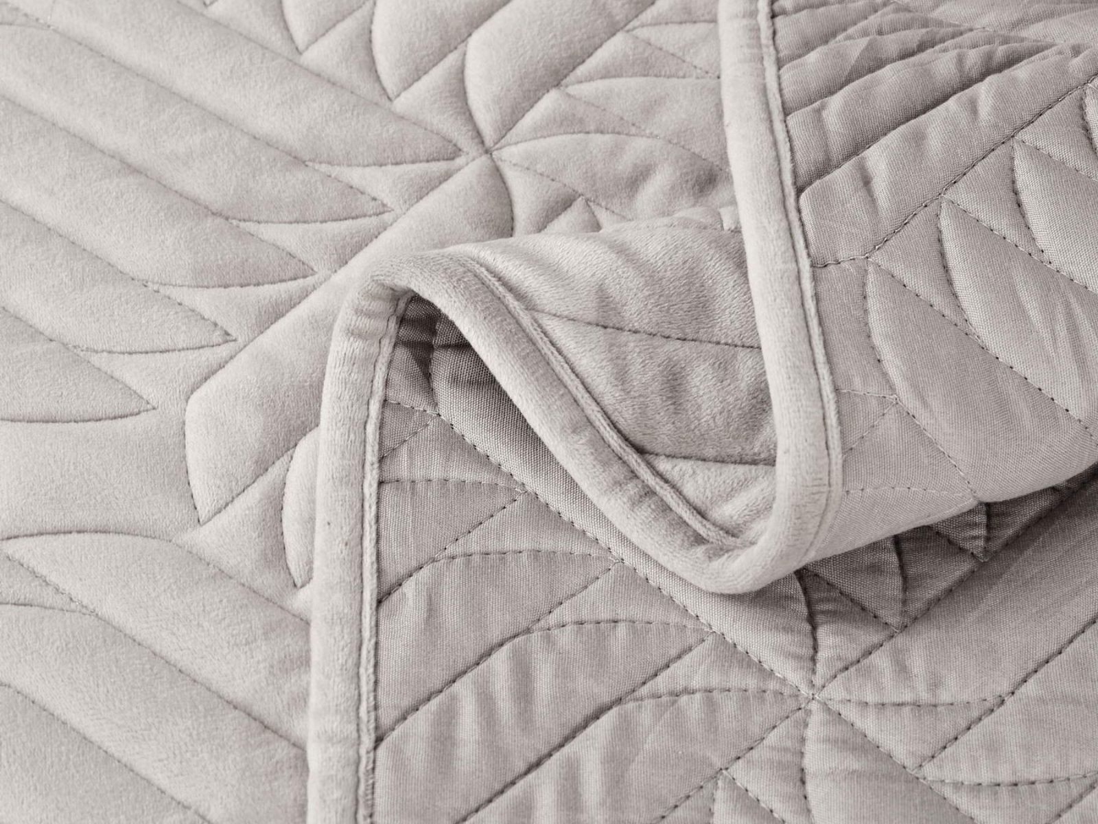 Покрывала выполнены в 10 оттенках: крем, мокко, пепельный, песочный, светло-бежевый, светло-серый, серый, темно-серый, чайная роза и черный. Стежка в виде геометрического орнамента подойдет к любому современному интерьеру. Из-за особого плетения, велюровая ткань покрывала отражает свет и красиво переливается при различном освещении.